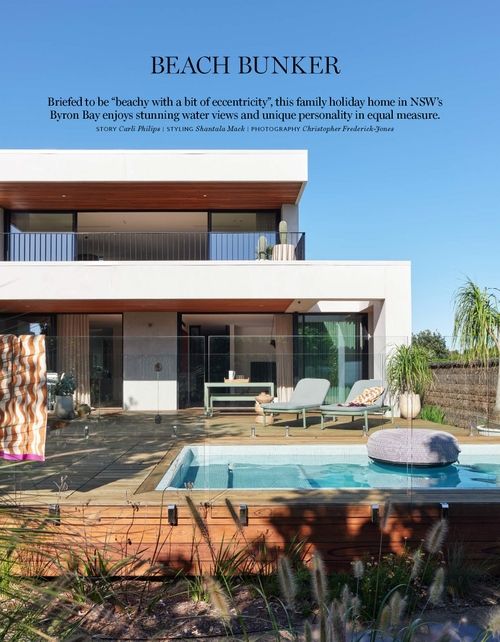 The interplay of materials and finishes within the house creates an element of surprise as one navigates from the welcoming timber entry alcove to the strikingly modern steel and terrazzo centrepiece, leading to the plush and bold sunken lounge area.